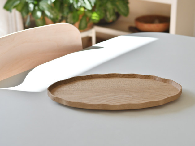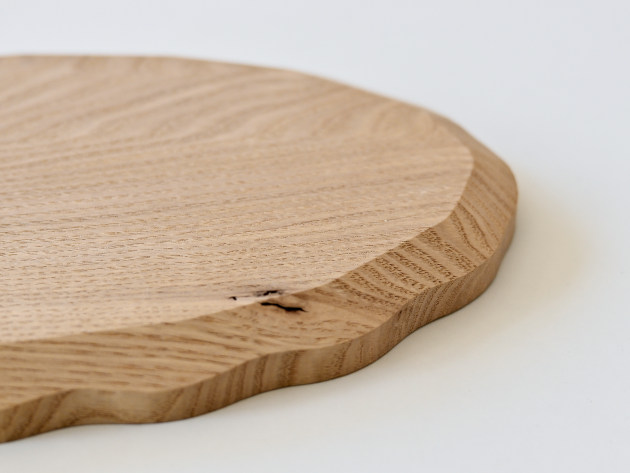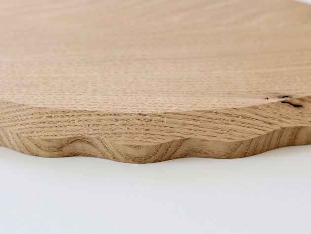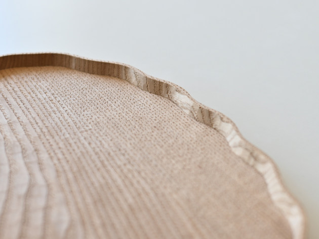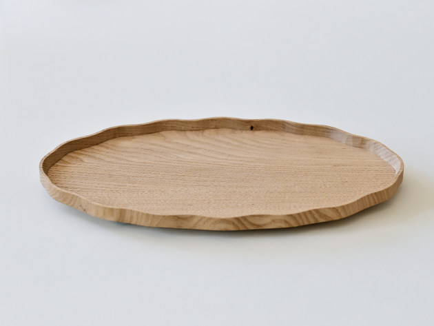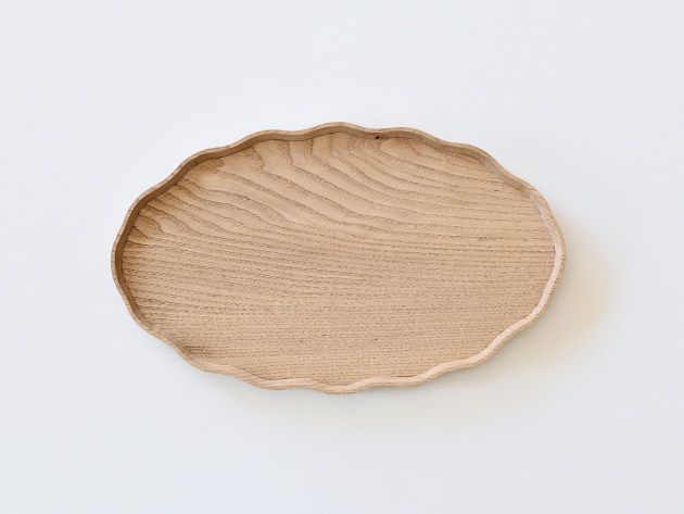 一枚ずつ手で刳り出して作った、波のようなドレープのあるオーバル盆。 とても手間のかかる仕事です。裏側まで美しい。 お茶の時間や晩酌セットに。お皿として、料理を盛りつけていただいても結構です。 ※多少の節や虫食いの穴がありますが、うつわの個性としてお楽しみください。 ■サイズ:ヨコ32.5cm×タテ19.5cm×高さ2.2cm ※色や木目がひとつずつ異なること、また節が含まれている場合があることをご了承下さい。