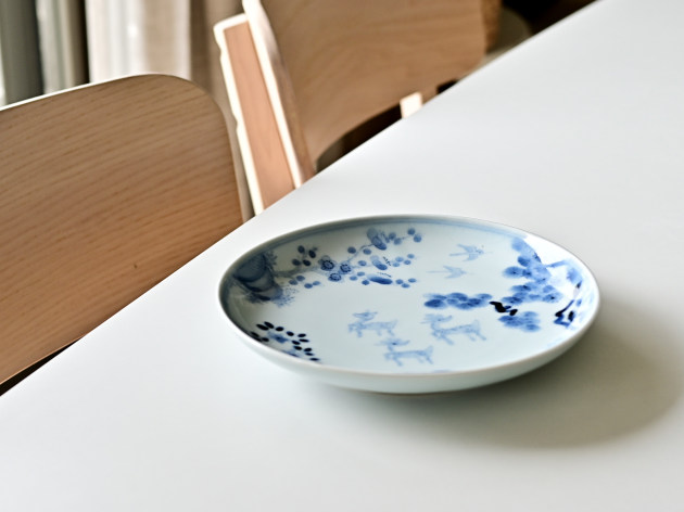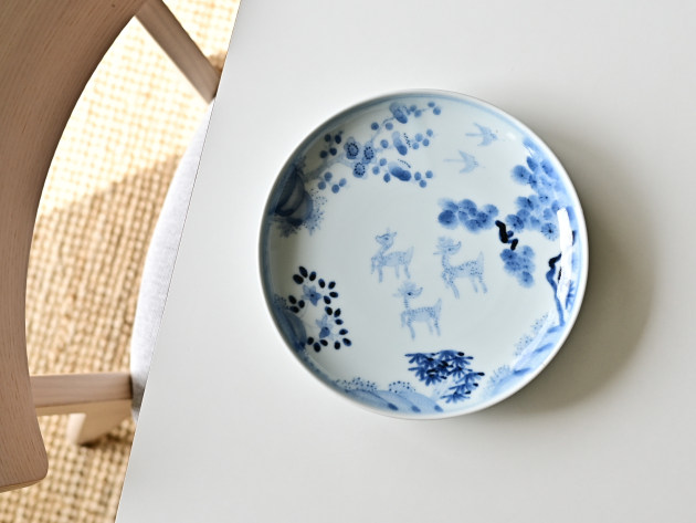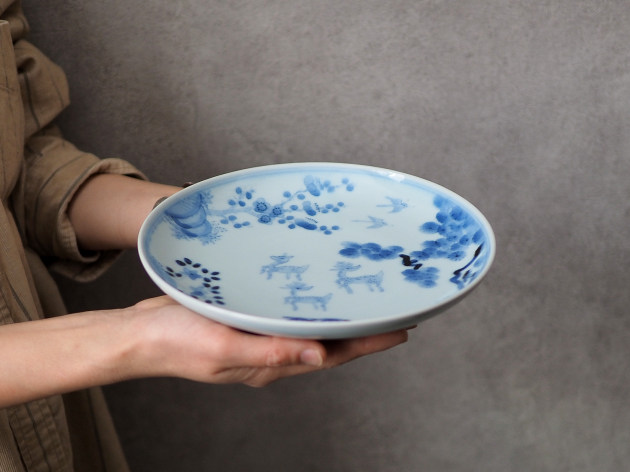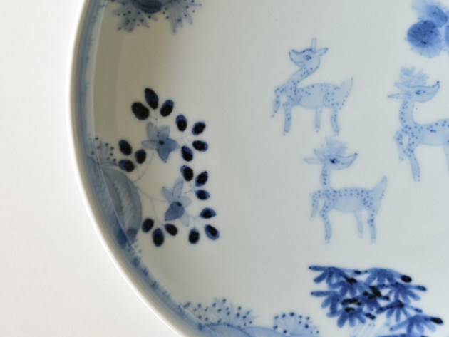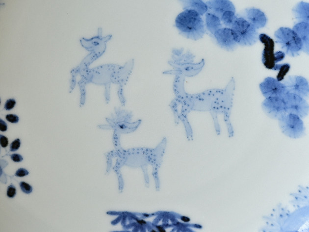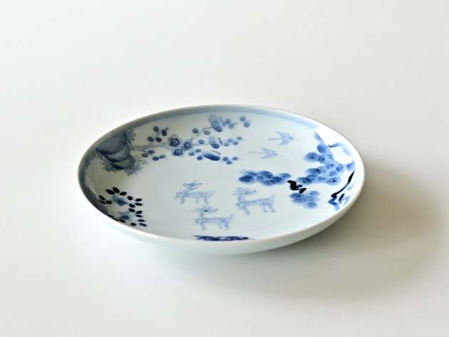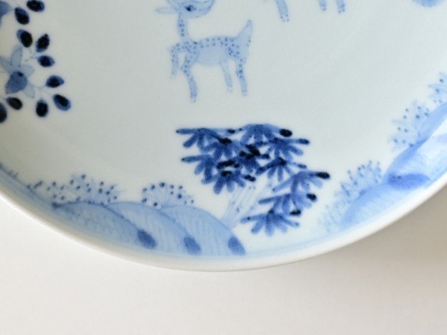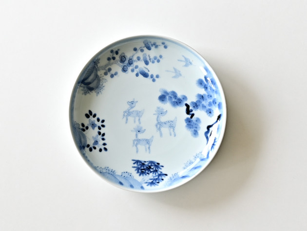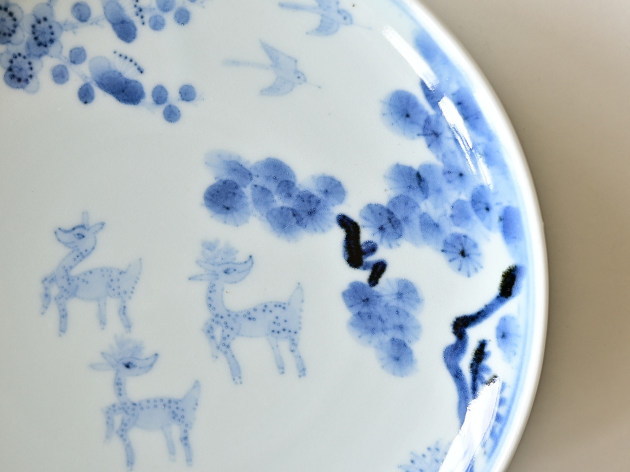 鹿は、神様の乗り物でもある聖獣。でも清水さんが描くと、どことなくユーモラスです。 よく見ると松、竹、梅も描かれ、とても目出度い七寸皿。お正月などハレの日にも活躍してくれそうです。 ※ピンホール(小さな穴)、鉄粉(小さな黒い点)などがありますが、うつわの個性としておたのしみください。 ■サイズ:径21.2cm×高さ3.5cm ※手作りの為、大きさ、形、色、模様がひとつずつ多少異なることをご了承下さい。