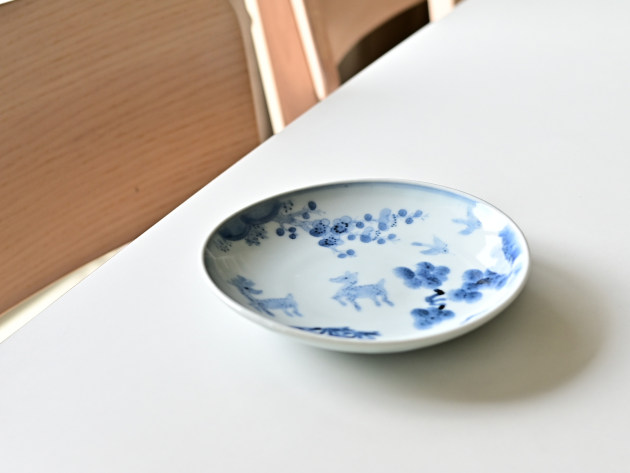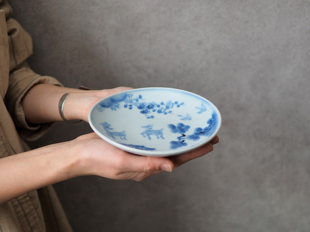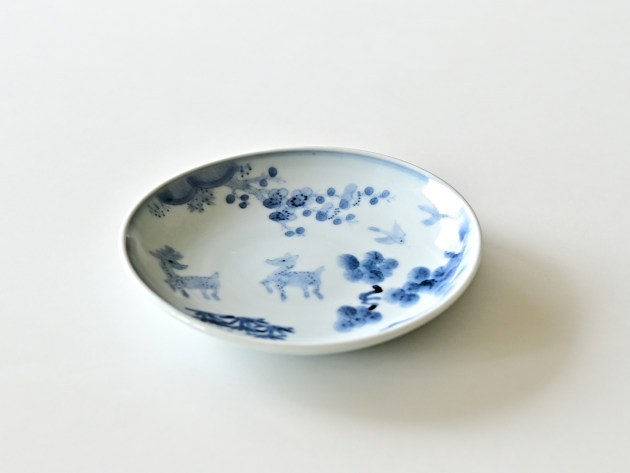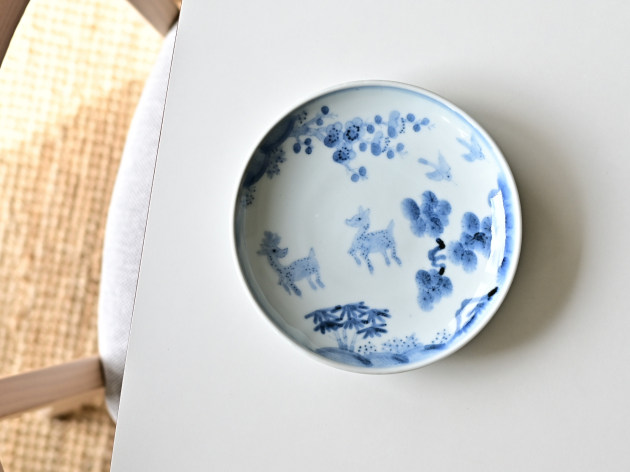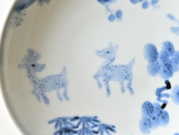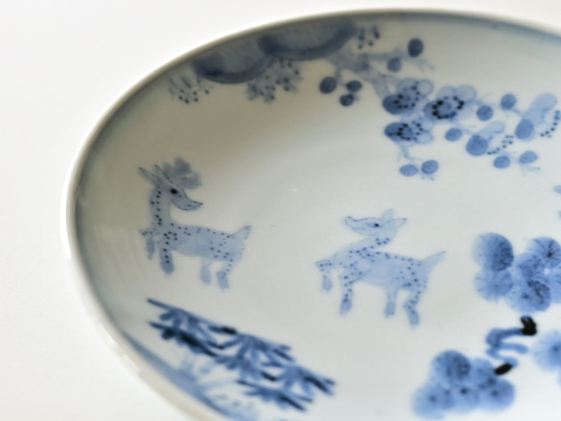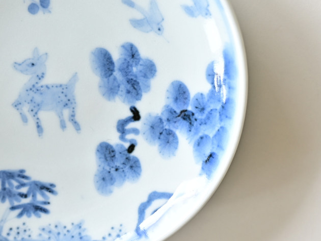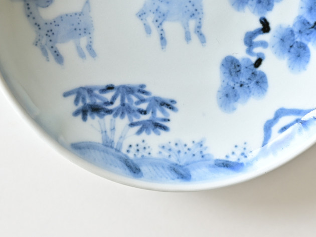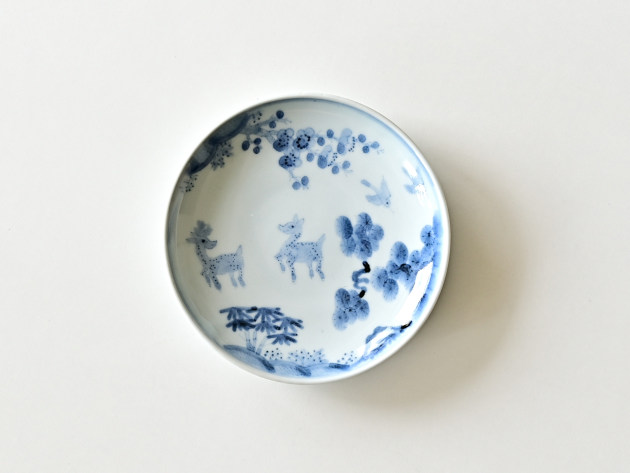 鹿は、神様の乗り物でもある聖獣。でも清水さんが描くと、どことなくユーモラスです。 よく見ると松、竹、梅も描かれ、とても目出度い五寸皿。お正月などハレの日にも活躍してくれそうです。 ※ピンホール(小さな穴)、鉄粉(小さな黒い点)などがありますが、うつわの個性としておたのしみください。 ■サイズ:径15.0cm×高さ2.8cm ※手作りの為、大きさ、形、色、模様がひとつずつ多少異なることをご了承下さい。