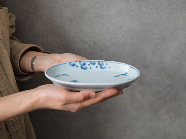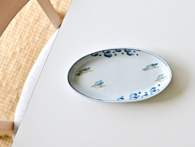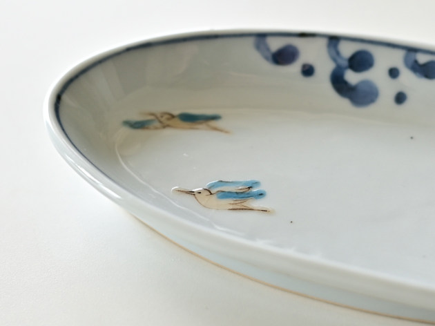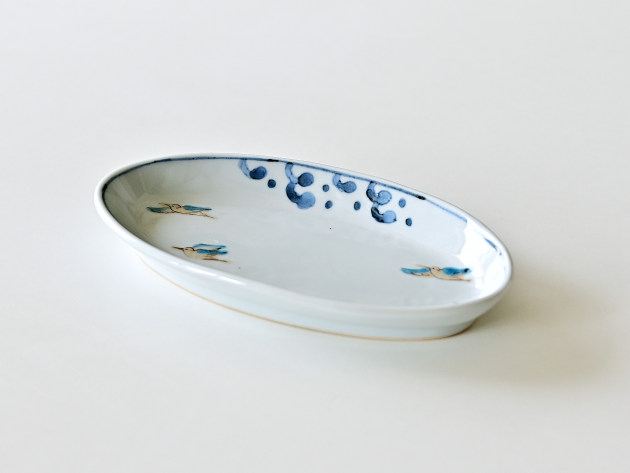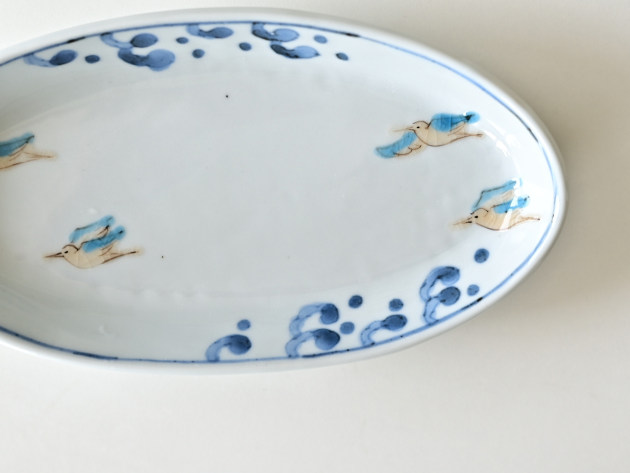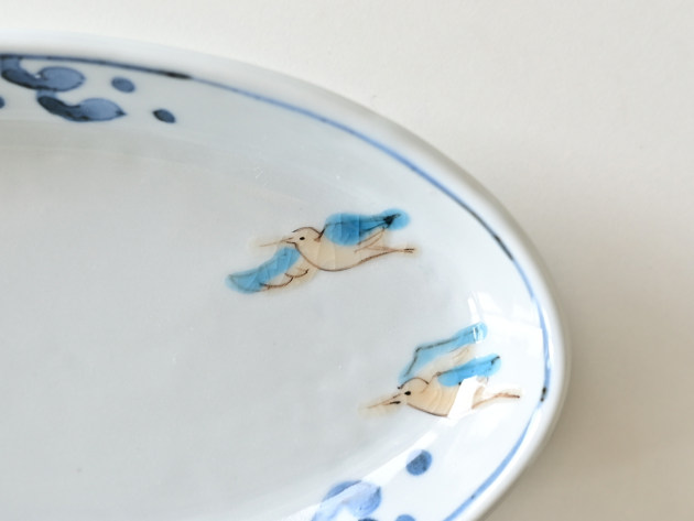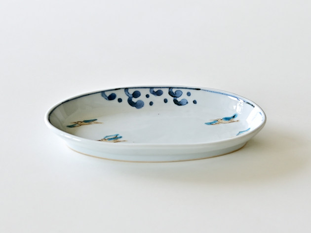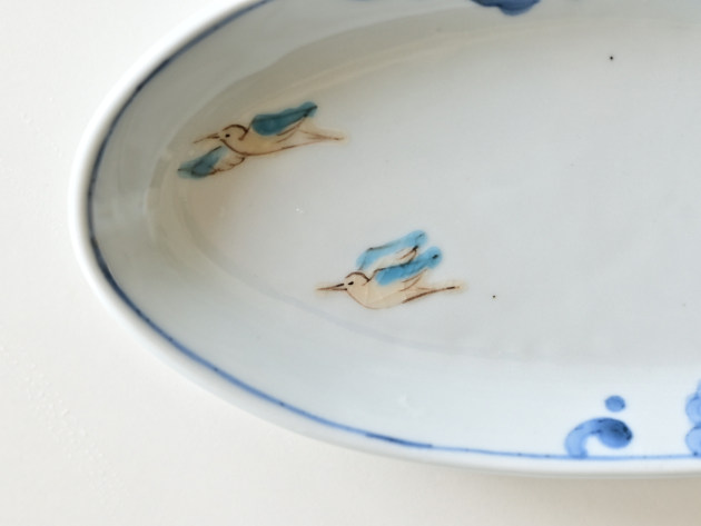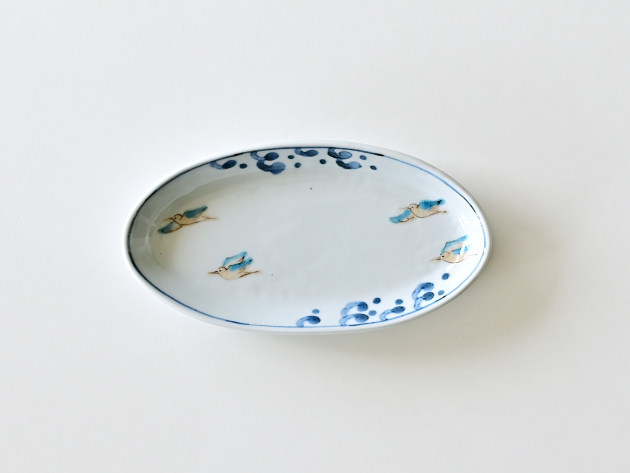 染付で波文、色絵で千鳥を描いた、かわいらしい楕円皿です。 卵焼きなどの、ちょっとしたおかずを盛りつけるときに活躍してくれます。 ※ピンホール(小さな穴)、鉄粉(小さな黒い点)などがありますが、うつわの個性としておたのしみください。 ■サイズ:ヨコ18.5cm×タテ9.7cm×高さ3.0cm ※手作りの為、大きさ、形、色、模様がひとつずつ多少異なることをご了承下さい。
