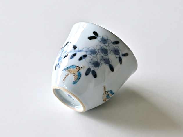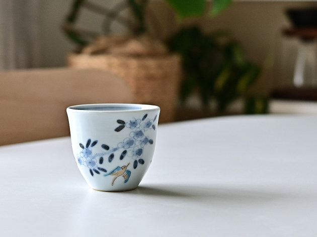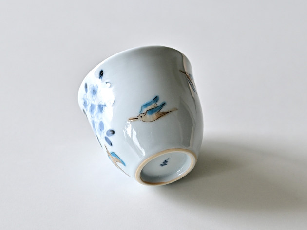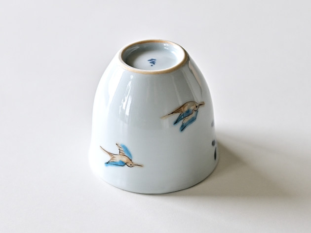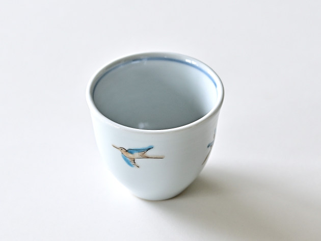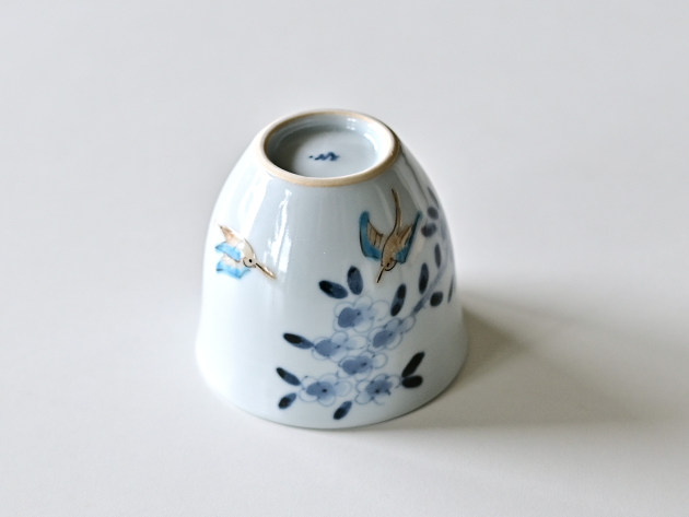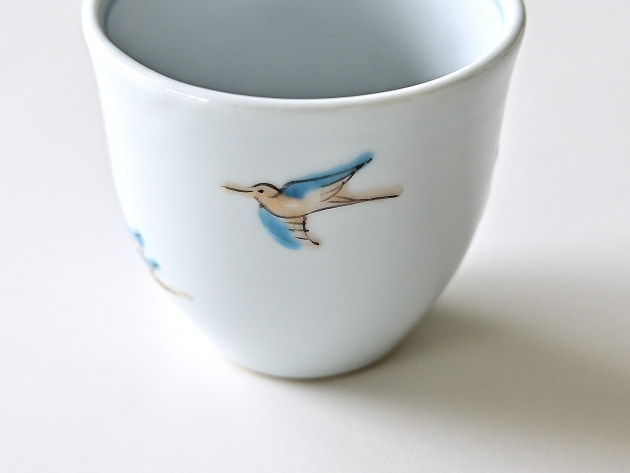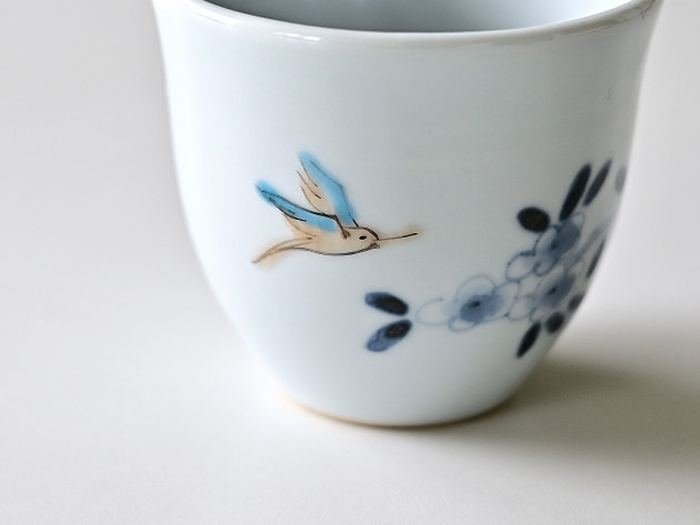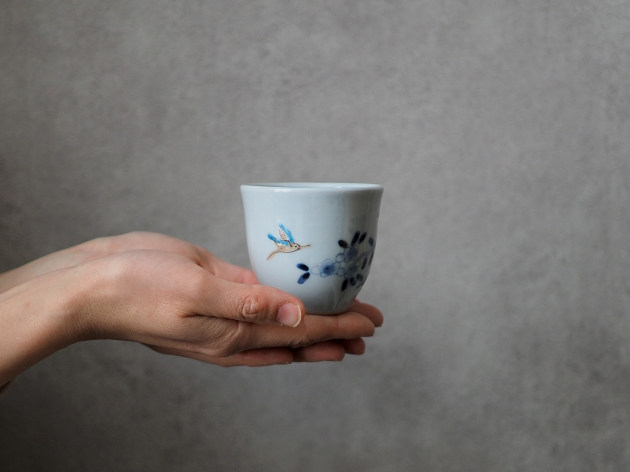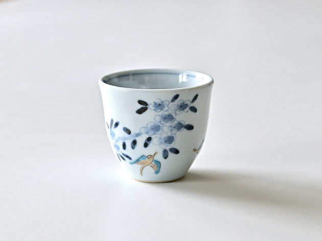 染付で草花文、上絵で青い鳥が描かれた、磁器製の汲み出しです。 容量は八分目で約100cc。ぽってりとした厚みがあり、安心してお使いいただけます。 ※ピンホール(小さな穴)、鉄粉(小さな黒い点)などがありますが、うつわの個性としておたのしみください。 ■サイズ:口径7.7cm×高さ6.7cm 100㏄ ※手作りの為、大きさ、形、色、模様がひとつずつ多少異なることをご了承下さい。