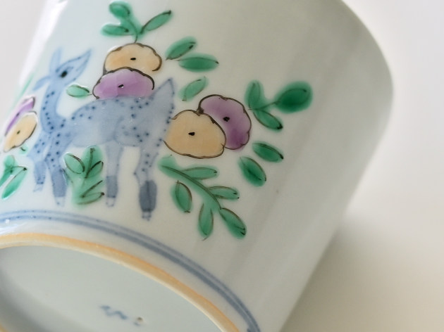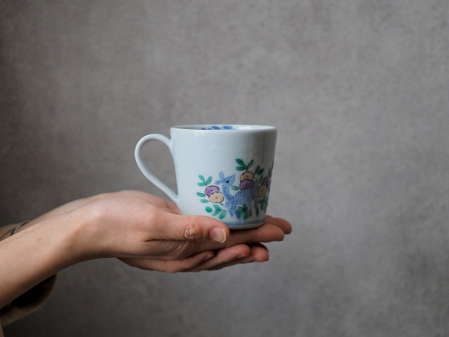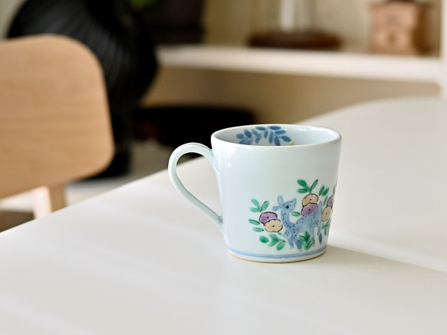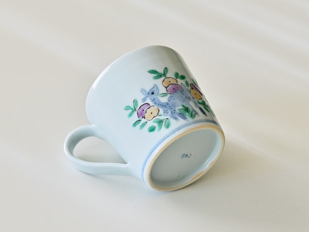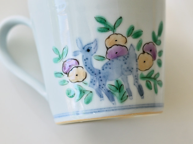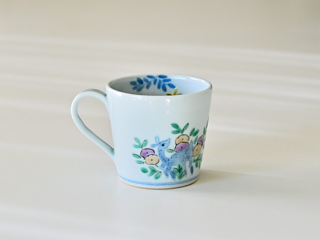 やわらかなタッチで草花文と鹿が描かれたマグカップです。 容量は八分目で約150cc。ぽってりとした厚みがあり、安心してお使いいただけます。 ※ピンホール(小さな穴)、鉄粉(小さな黒い点)などがありますが、うつわの個性としておたのしみください。 ■サイズ:口径8.2cm×高さ7.5cm 150㏄ ※手作りの為、大きさ、形、色、模様がひとつずつ多少異なることをご了承下さい。