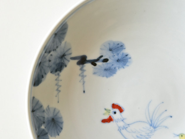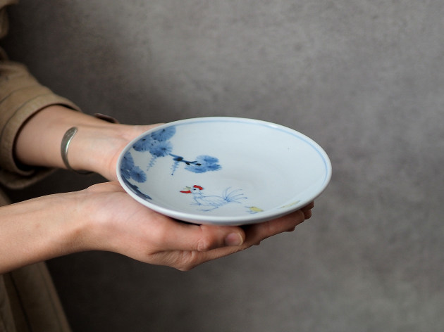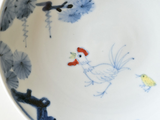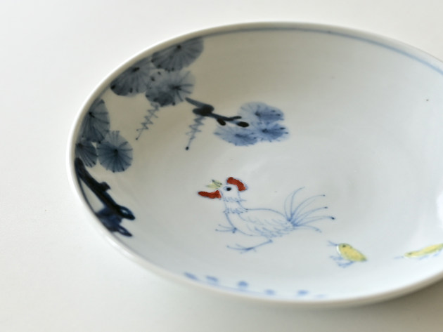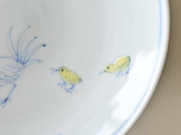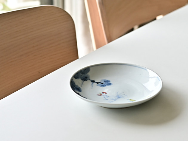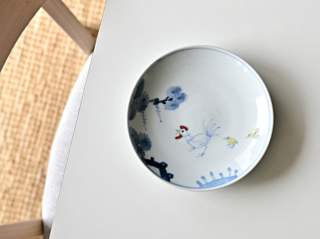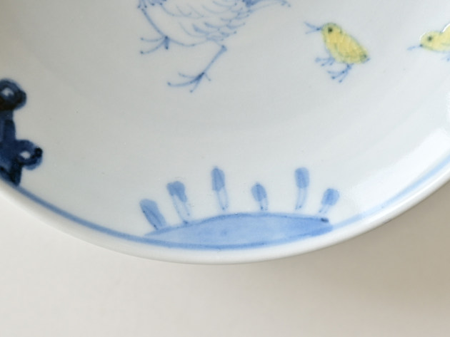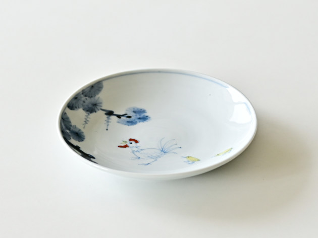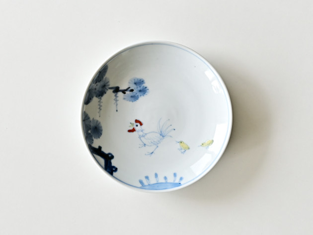 ニワトリとひよこが描かれた、ほほえましい五寸皿。
