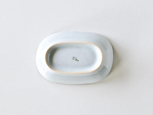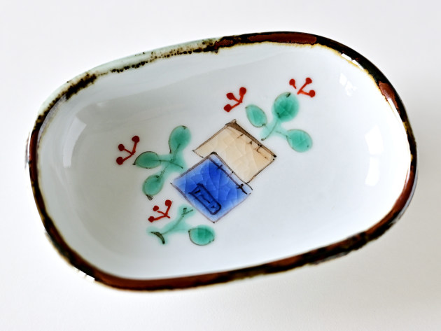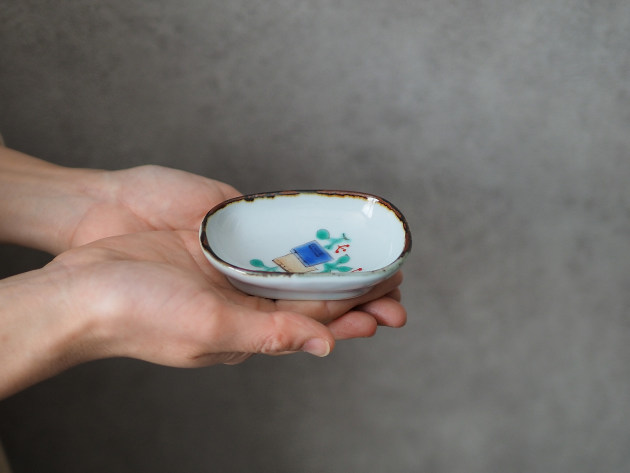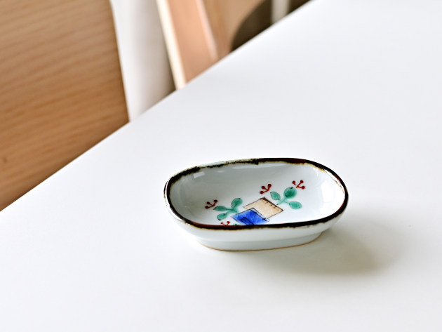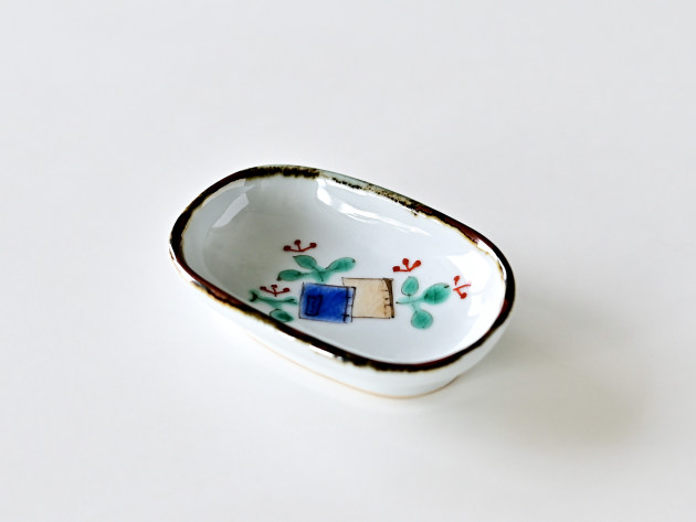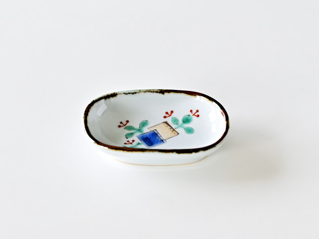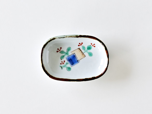 かわいらしい色使いで草花と書物が描かれた楕円豆皿。