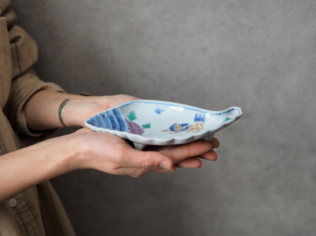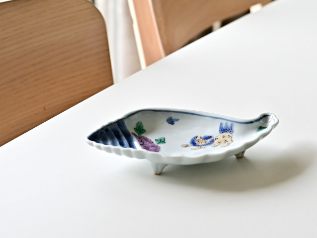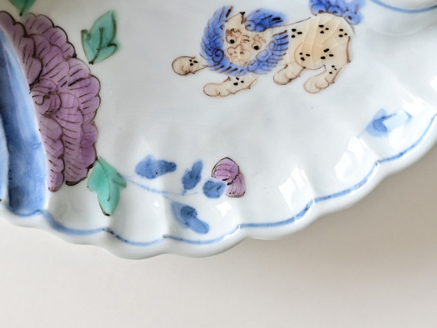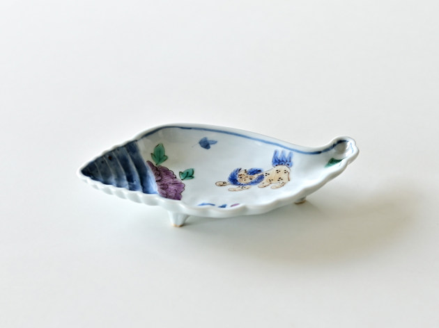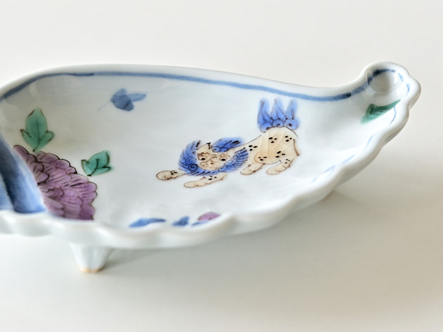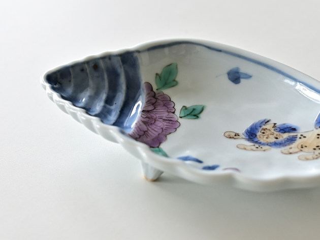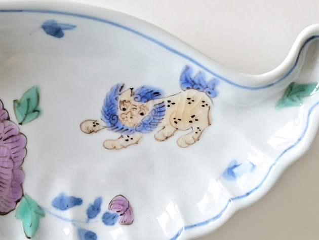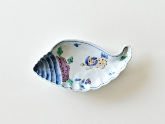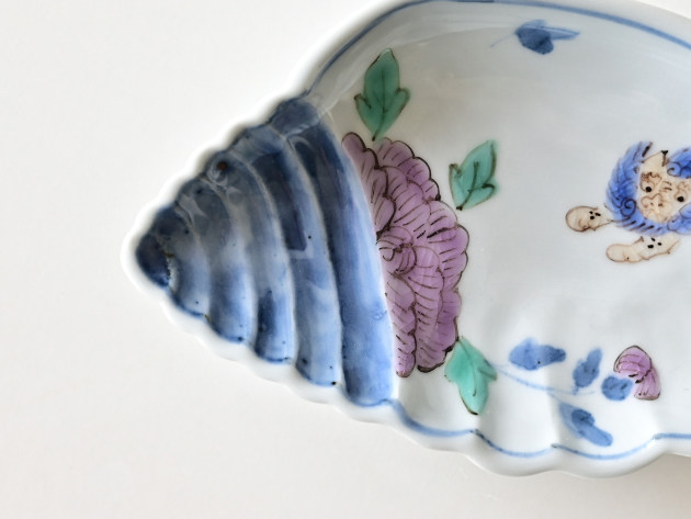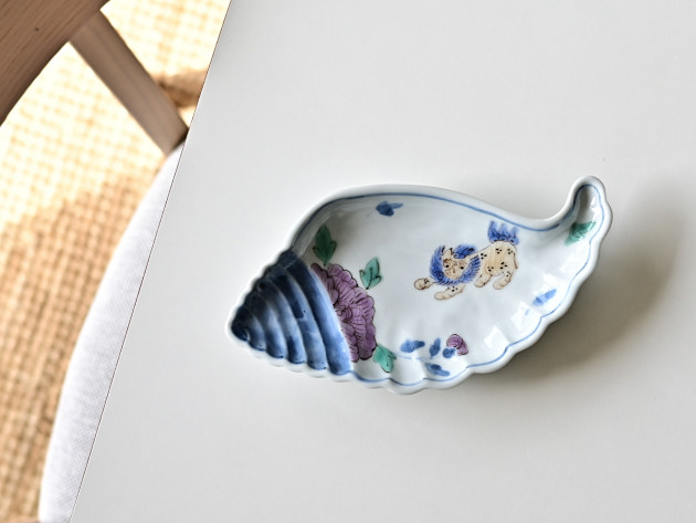華やかな牡丹文と、可愛らしい狛犬の対比がたのしいお皿。貝殻の形をしています。 ひとり分のお刺身を盛り付けると、とても素敵だと思います。 ※ピンホール(小さな穴)、鉄粉(小さな黒い点)などがありますが、うつわの個性としておたのしみください。 ■サイズ:ヨコ18.0cm×タテ9.5cm×高さ3.0cm ※手作りの為、大きさ、形、色、模様がひとつずつ多少異なることをご了承下さい。
