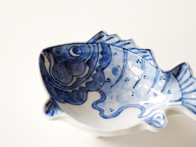 まん丸に太った魚をかたどった、小さめの向付。ユーモラスな表情をしています。
