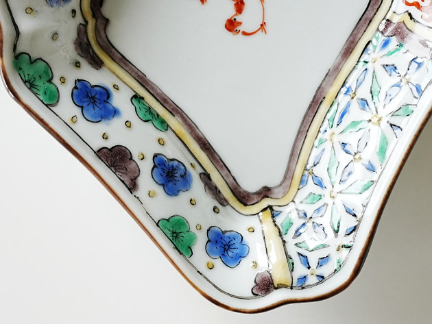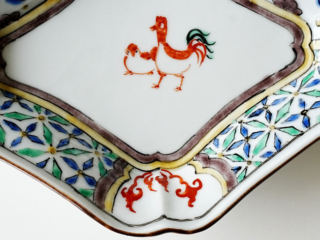 主役の鶏は赤絵であっさりと描かれ、周りを囲む花文は細やかに描き込まれています。