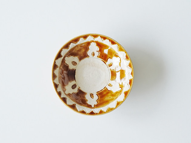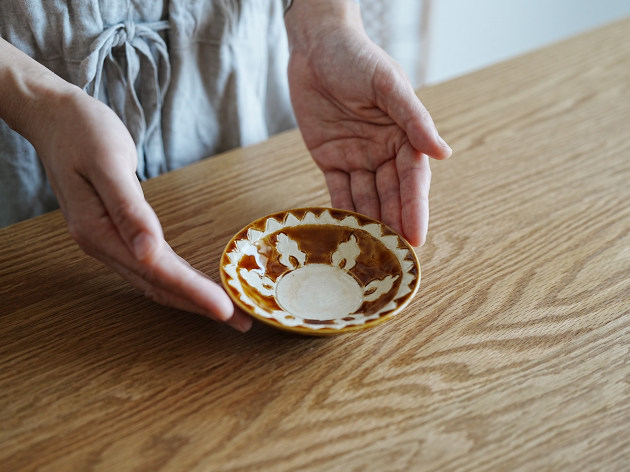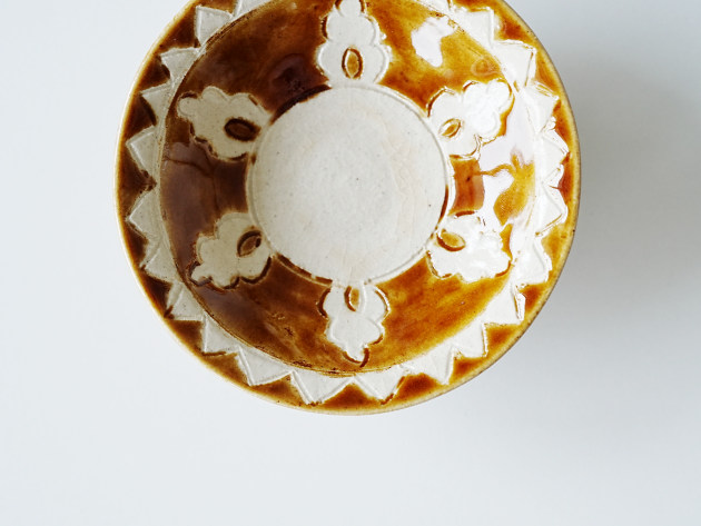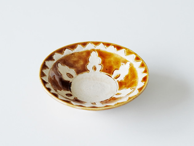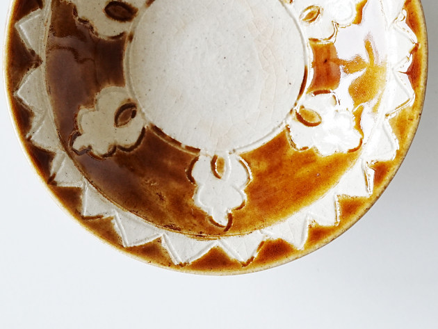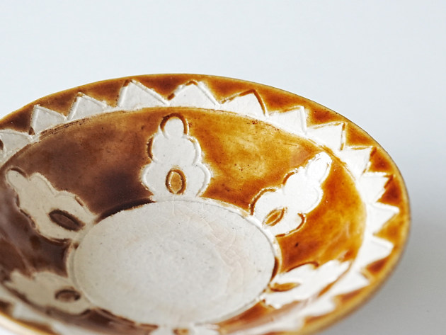 文様を手で彫ったのち、釉薬を掛け分けて焼いています。