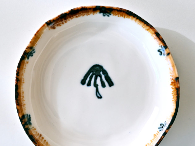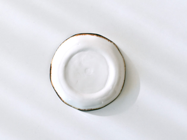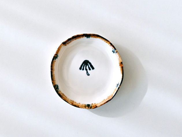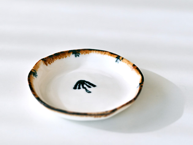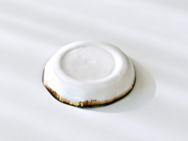 磁器に印判(いんばん)と呼ばれるスタンプで、キノコの絵を描いた豆皿です。