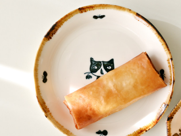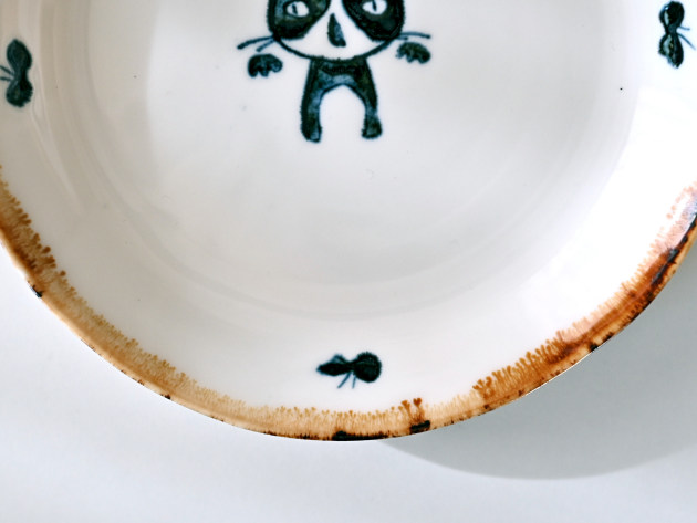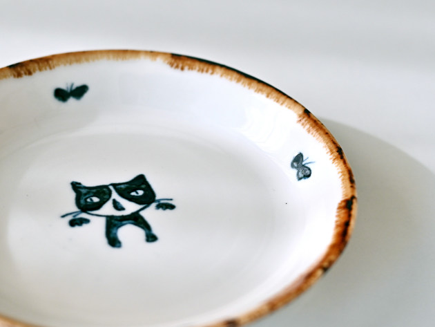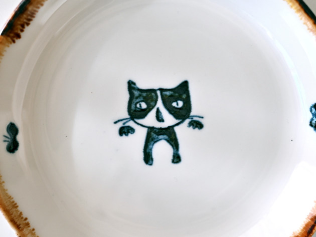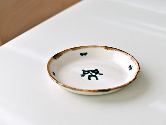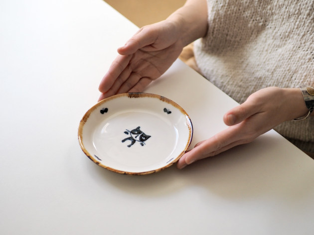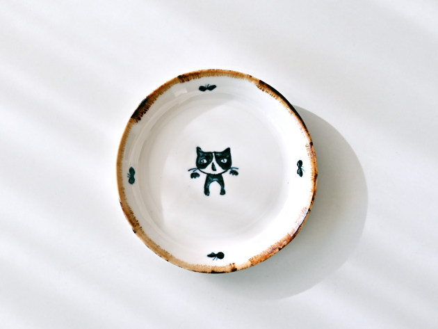 磁器に印判(いんばん)と呼ばれるスタンプで、ネコの文様を捺した小皿です。