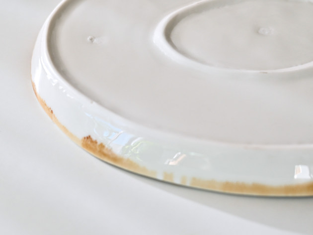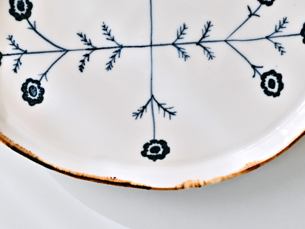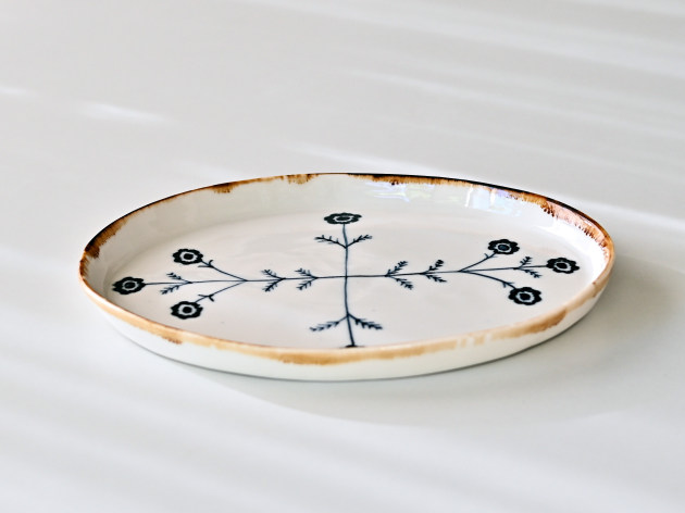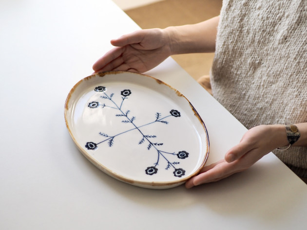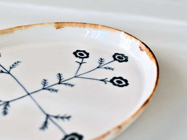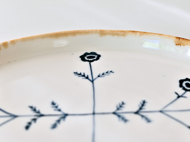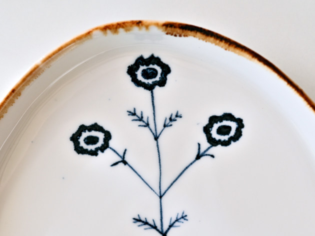 磁器に印判(いんばん)と呼ばれるスタンプで、アネモネの文様を捺したプレート。