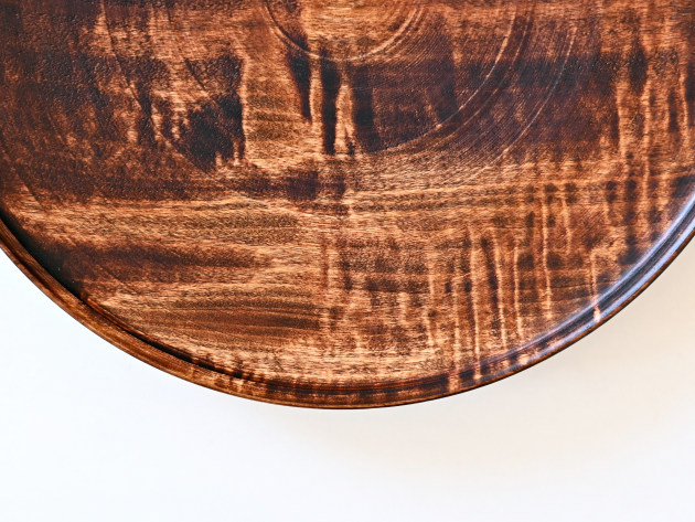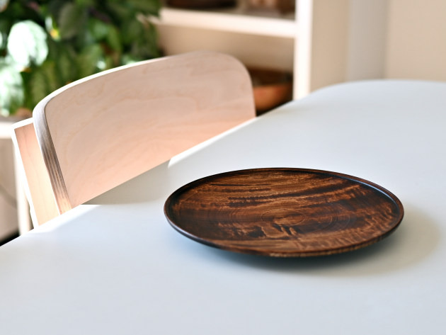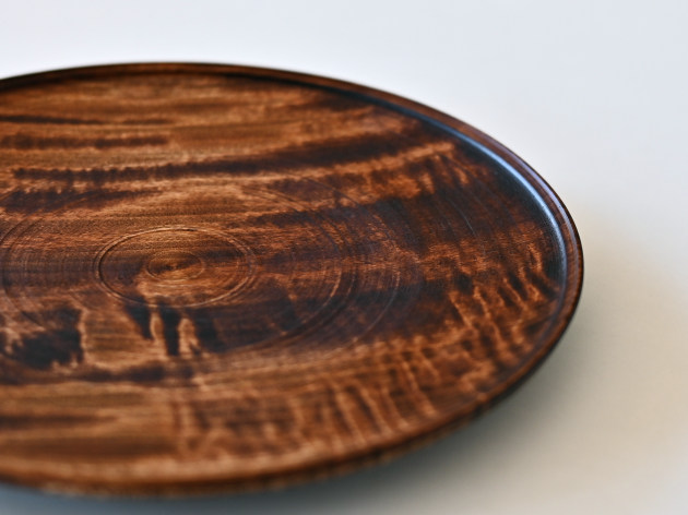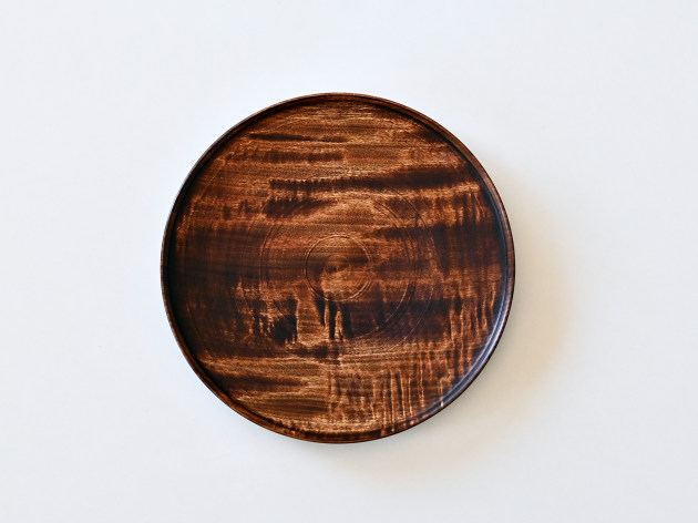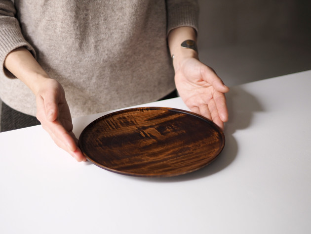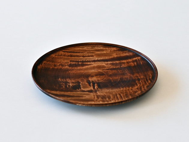 液体ガラスを染み込ませた、トチの木のお盆です。うっすらと浮かび上がった木目がドラマティック。拭きうるしの後にガラスコーティングをした、トチの木のお皿です。うっすらと浮かび上がった木目がドラマティック。 ガラスのような光沢はなく、さらさらとした手触りです。水をはじくので気軽にお使いいただけます。 ■サイズ:径21.8cm×高さ2.0cm ※手作りの為、大きさ、形、色、模様がひとつずつ多少異なることをご了承下さい。