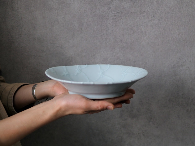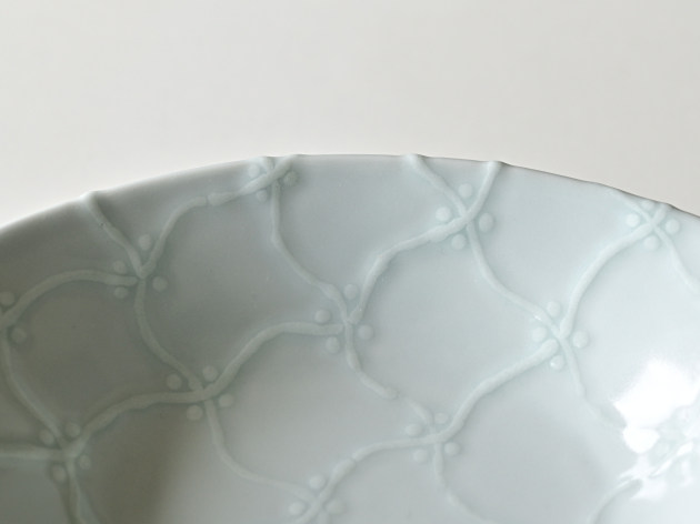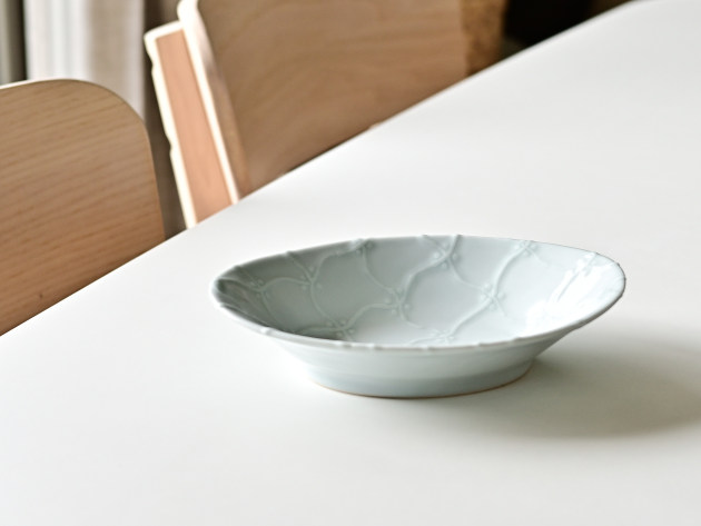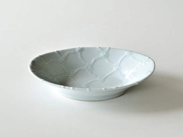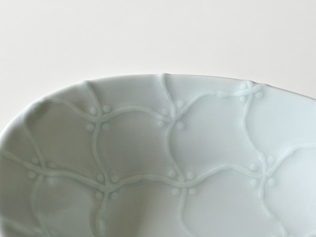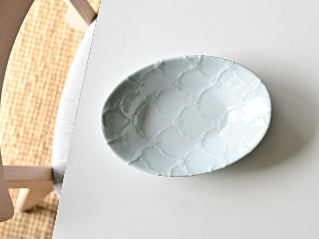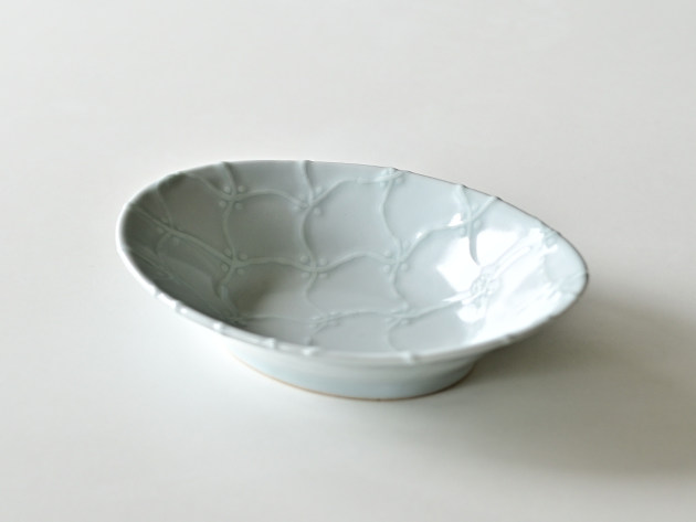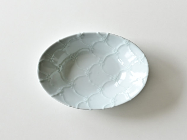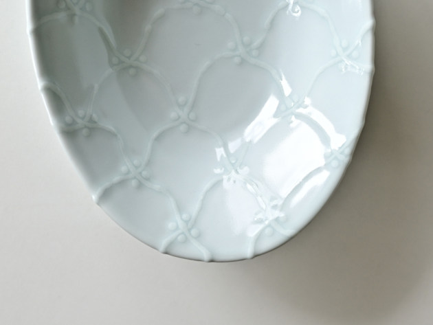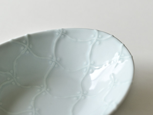 よろけつなぎ文がイッチンで立体的に描かれた、磁器の楕円鉢です。