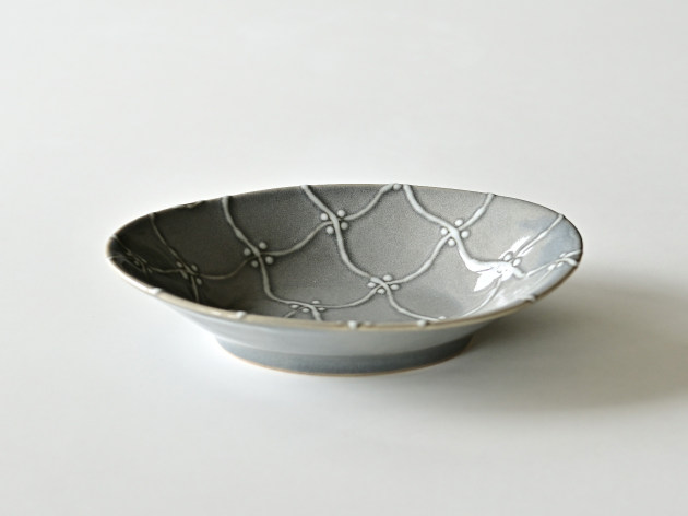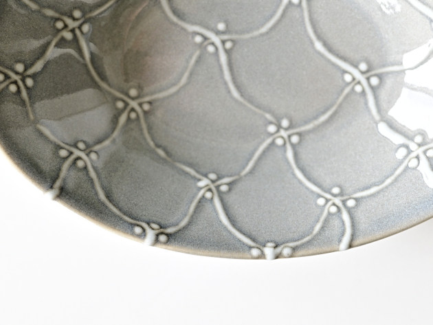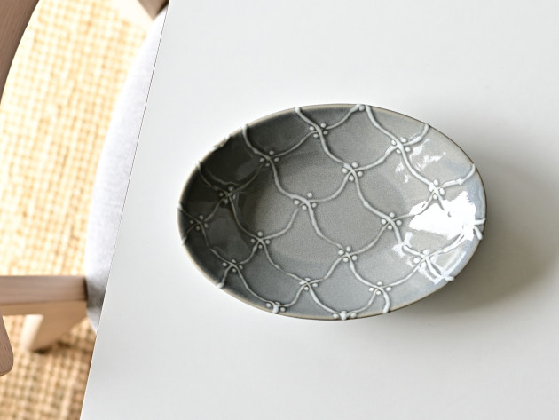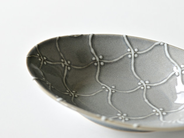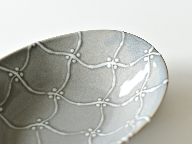 よろけつなぎ文がイッチンで立体的に描かれた、磁器の楕円鉢です。