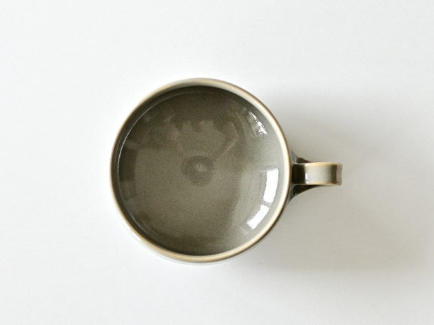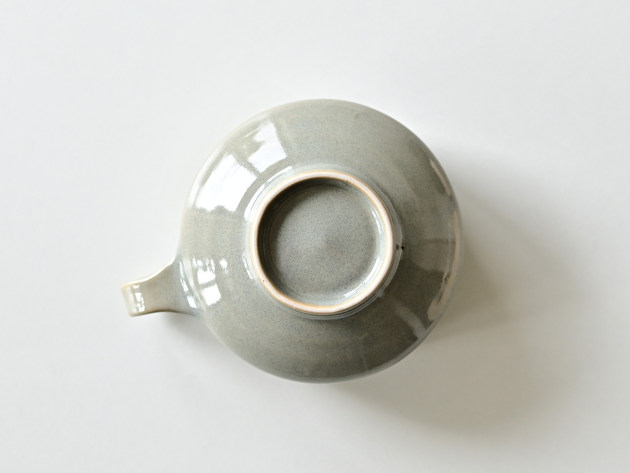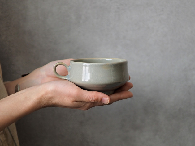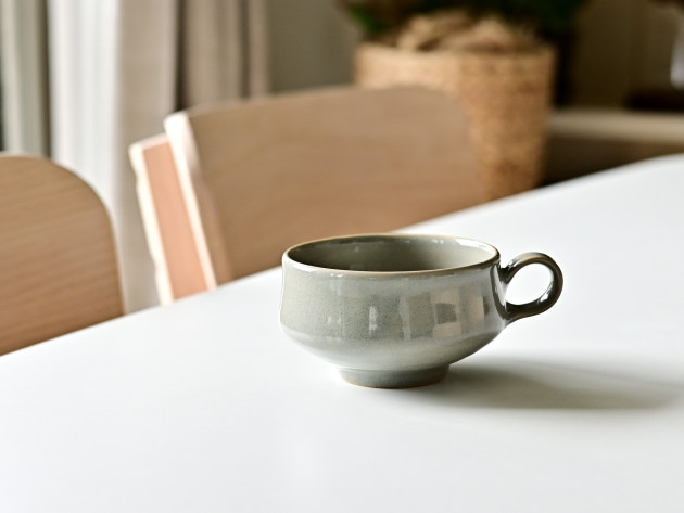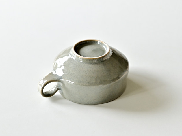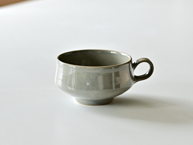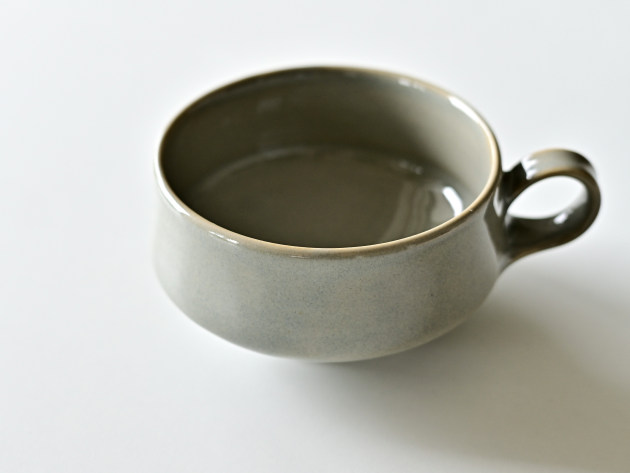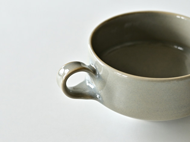 小さな持ち手がついたスープカップ。グレーの釉薬が掛けられた、やわらかな表情の磁器です。