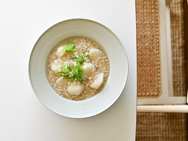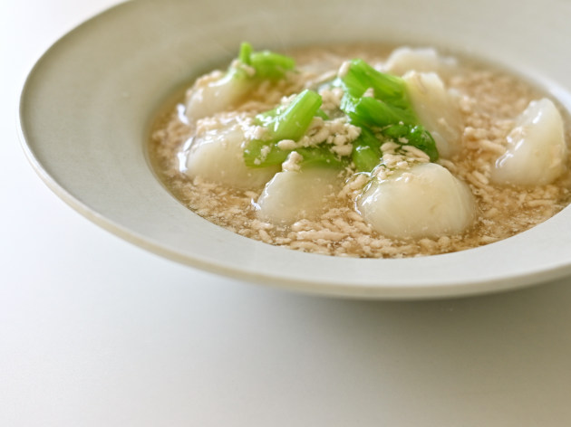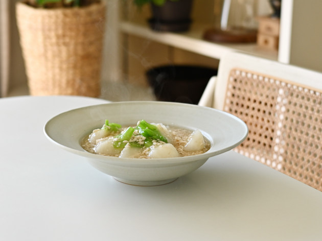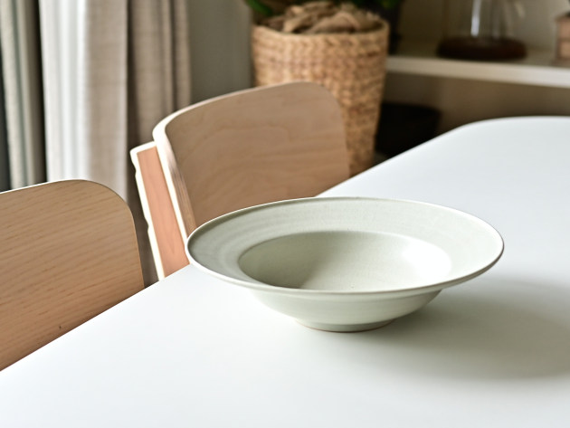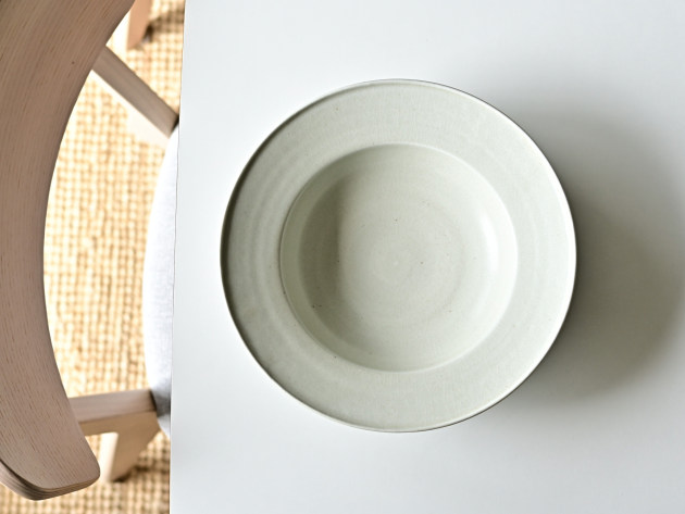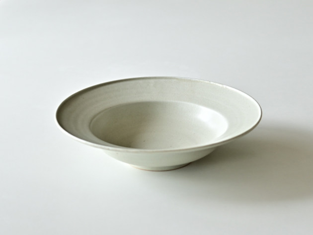 大きなリムのついた八寸鉢。深さがあるので、汁気のある煮物や麻婆豆腐などもよくあいます。