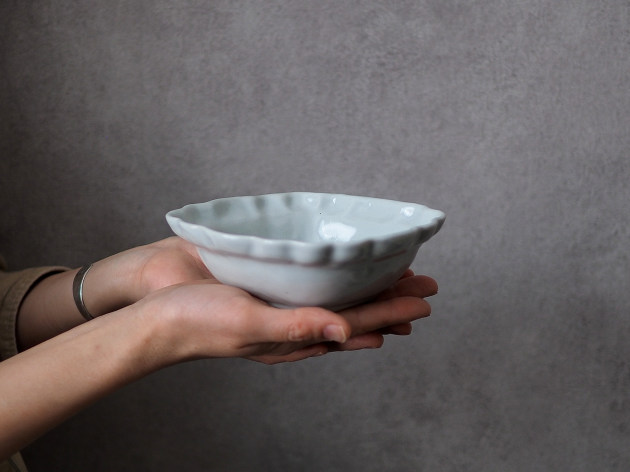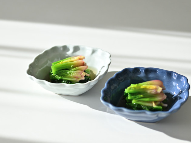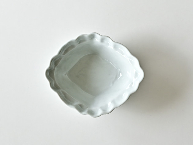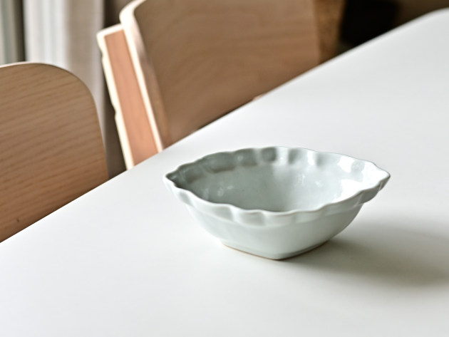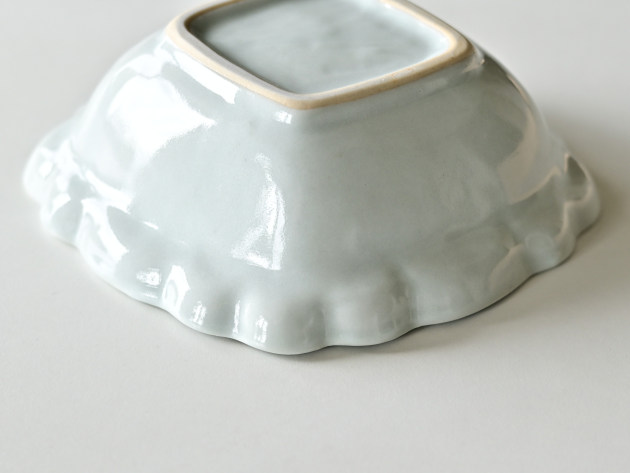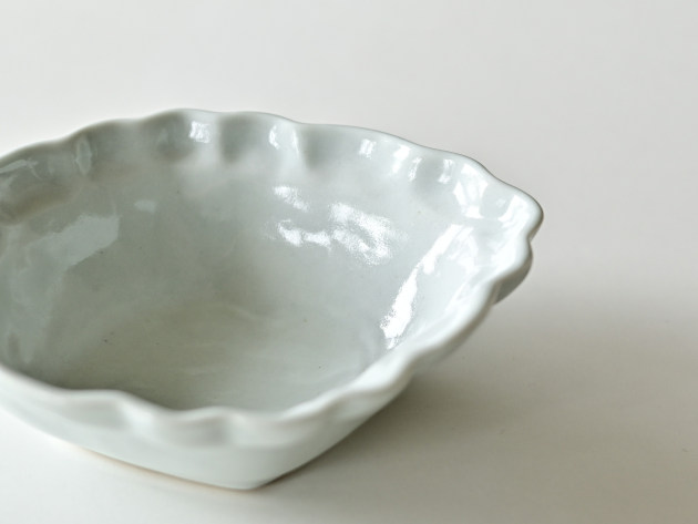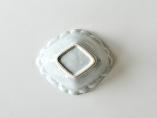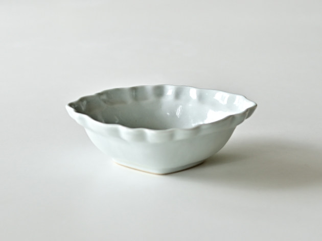 とろんとした釉薬がやわらかな雰囲気の、菱形の輪花鉢です。