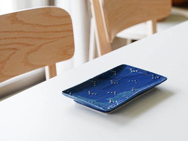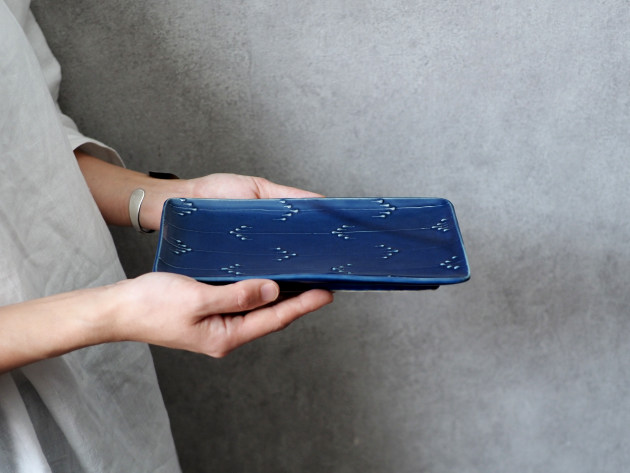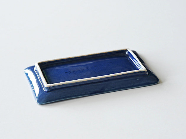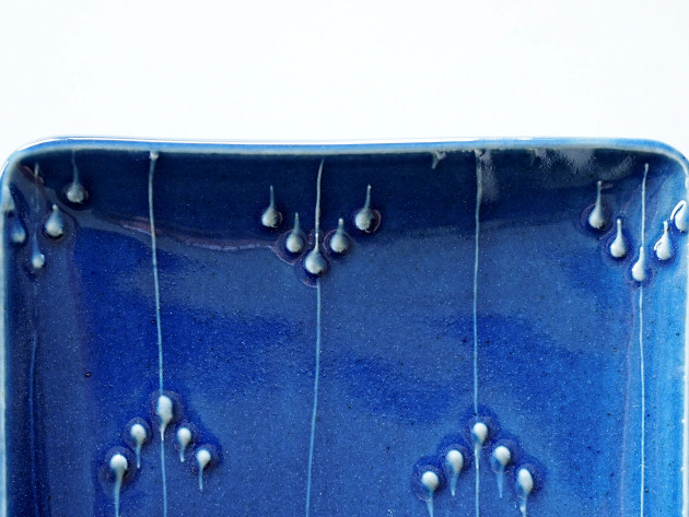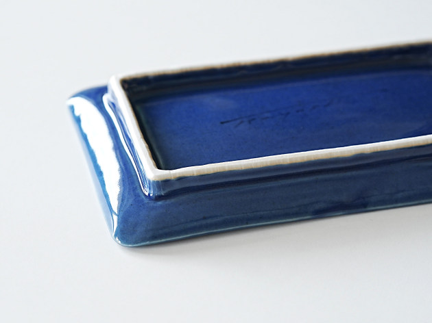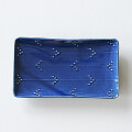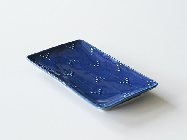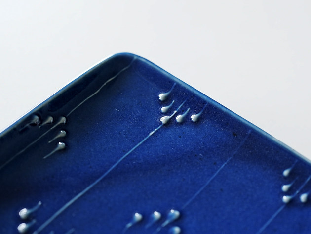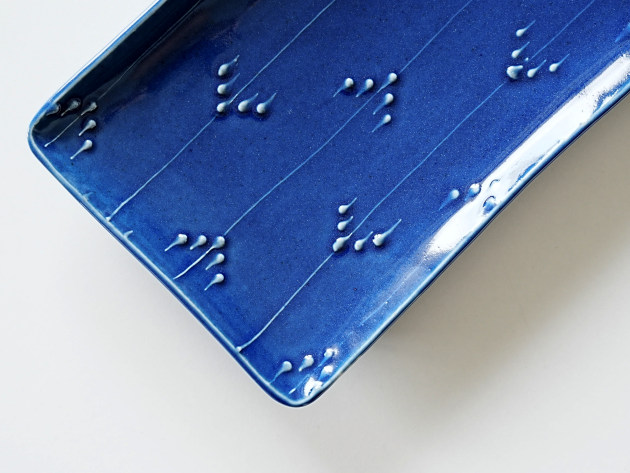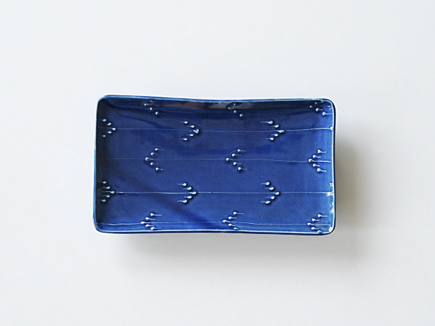 イッチンと呼ばれる技法で、立体的に矢羽根(やばね)文が描かれています。 焼き魚に焼きなす、卵焼きなどに。磁器製なので匂い移りの心配もありません。 ※瑠璃釉は特性上、ごく微細な傷でも目立ちやすく、すべての商品に多少のスリ傷が見られます。 ■サイズ:ヨコ21.7cm×タテ12.5cm×高さ2.3cm ※手作りの為、大きさ、形、色、模様がひとつずつ多少異なることをご了承下さい。