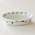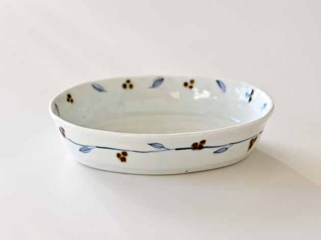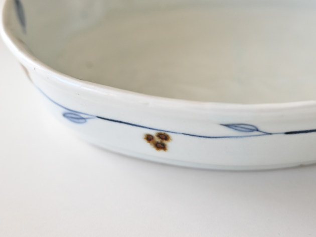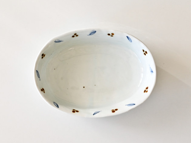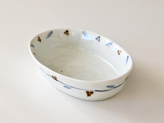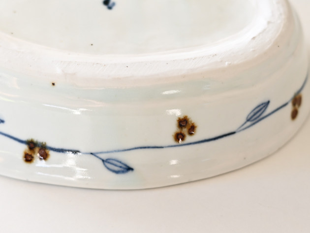深さのある楕円型の鉢です。染付と鉄絵で素朴な草文が描かれています。