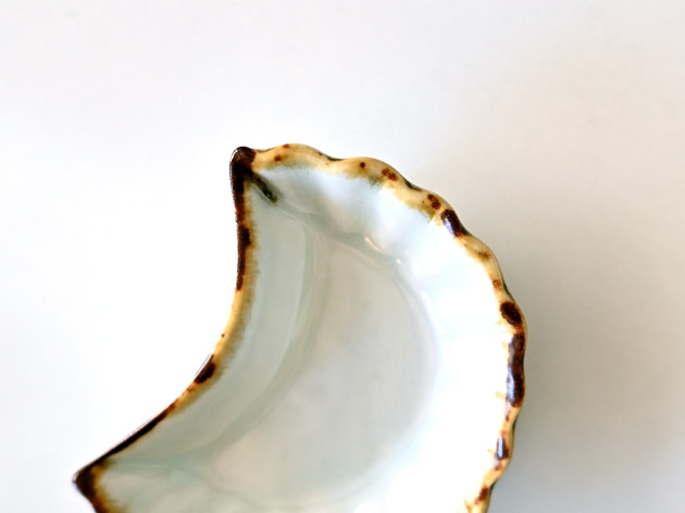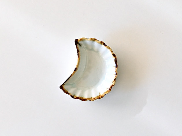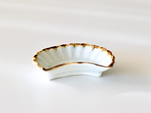 三日月をかたどった、可愛らしい白磁の豆皿。口辺は鉄絵で縁取りがされています。