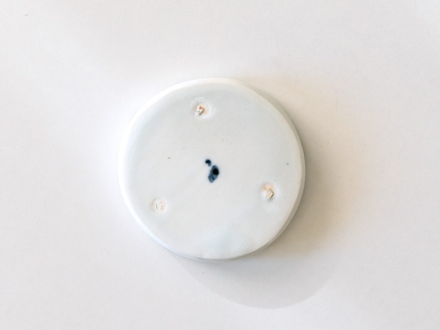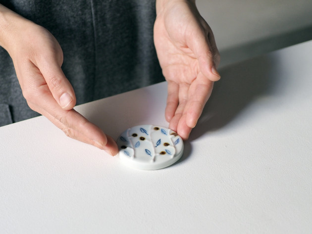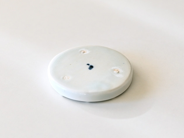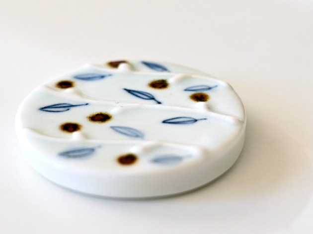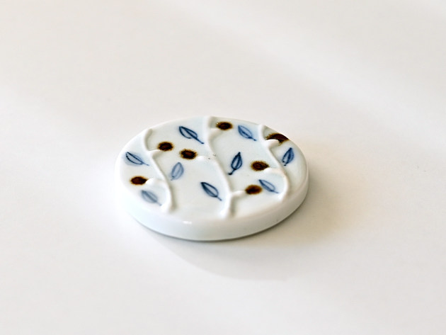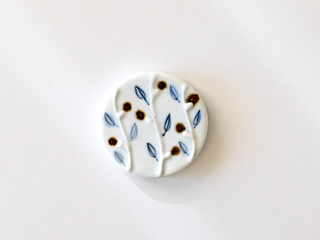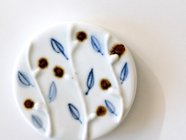 丸くて平らな豆皿。いっちんで茎、染付で葉、鉄絵で実が描かれています。