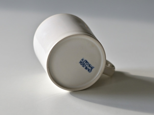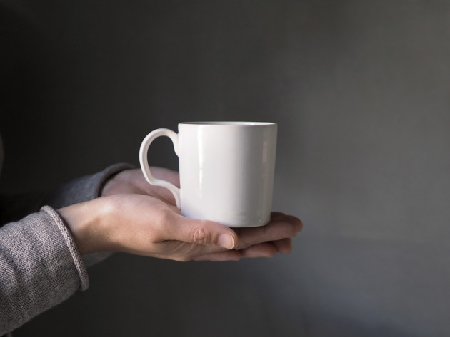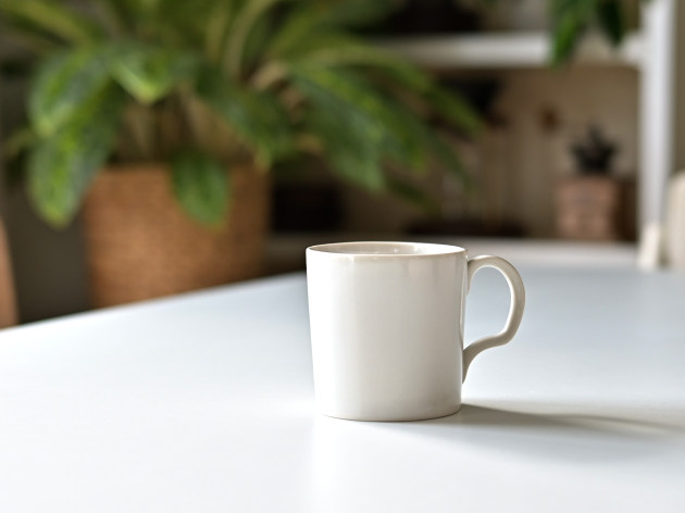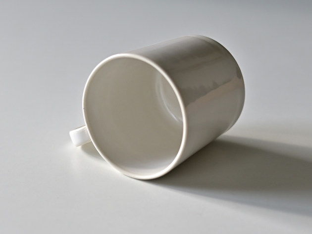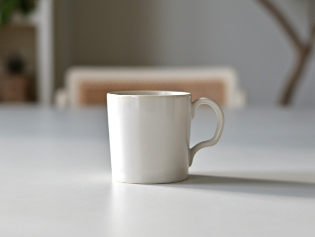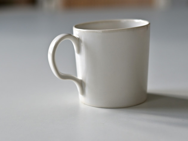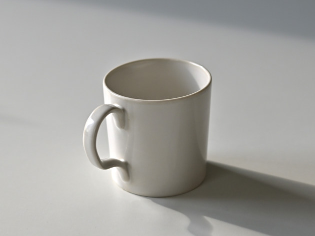 磁器製のシンプルな形のカップ。容量は八分目で約170ml。軽く、使いやすいです。