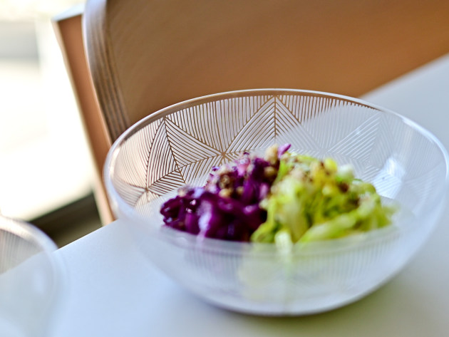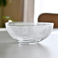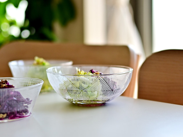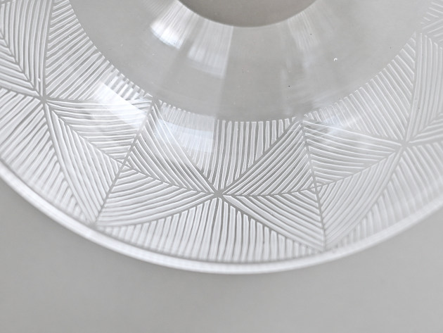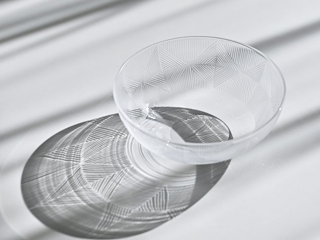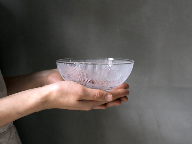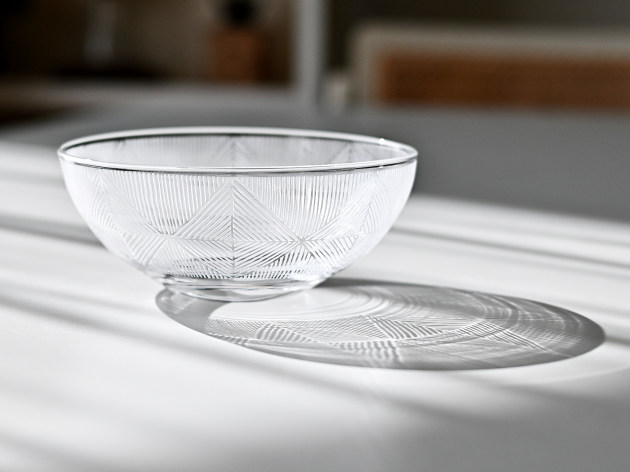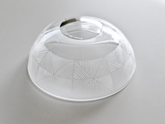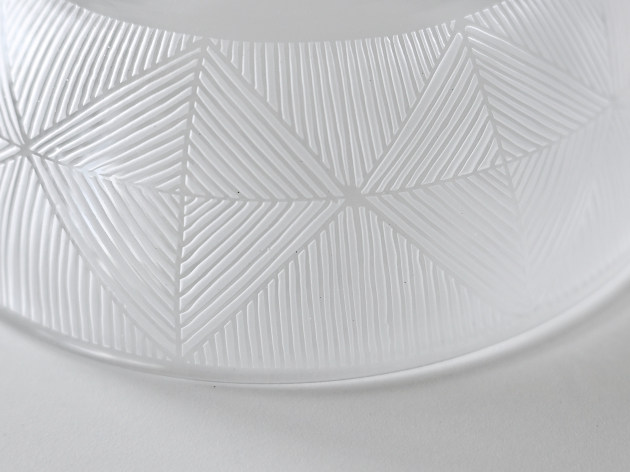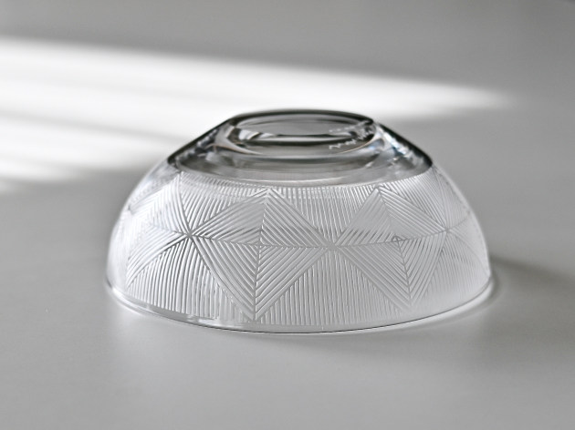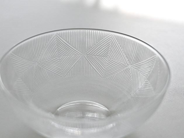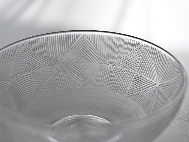 シンプルな形の鉢に、サンドブラストという技法で線文を彫っています。