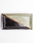 半分は茶褐色の黒釉、もう半分は象嵌で模様が描かれた、なんとも粋な長皿。