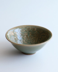 透き通った青磁が美しい、高麗風の鉢。陽刻で描かれた牡丹文が優雅です。
