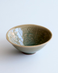 透き通った青磁に、優雅な蓮の花が陽刻で描かれています。