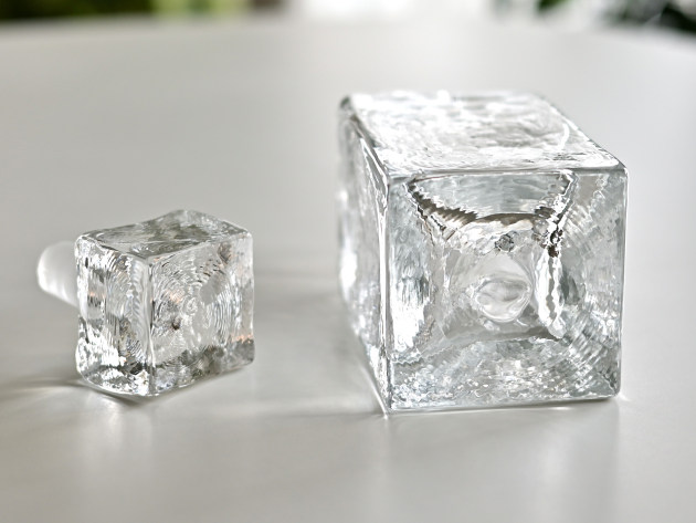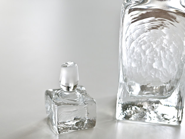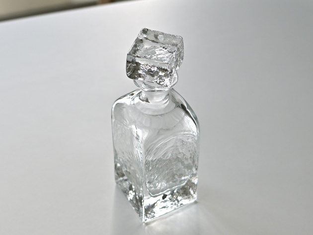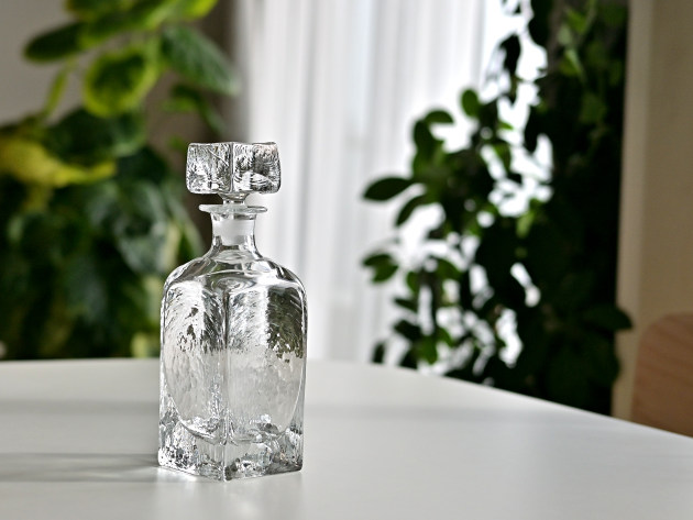 重厚感のあるボトル。蓋もなかなかの迫力。 ゆらゆらと波打った表面が光を反射して、とてもきれいです。容量は八分目で約400ml。 ウイスキーを入れるととても贅沢。もちろん、そのまま飾っておいても素敵です。 ■サイズ:(A)ヨコ8.0cm×奥行8.0cm×高さ24.0cm 400cc ※ガラス製品には小さなキズがついていたり、気泡や鉄粉が混じっていることがあります。 ※こちらの商品は、画像と同じ個体をお届けします。