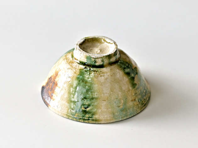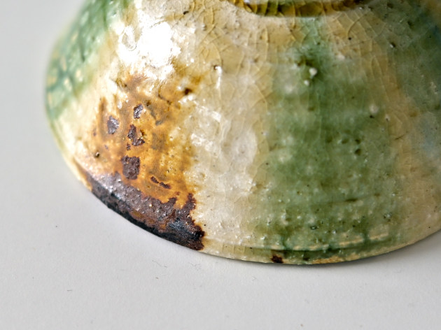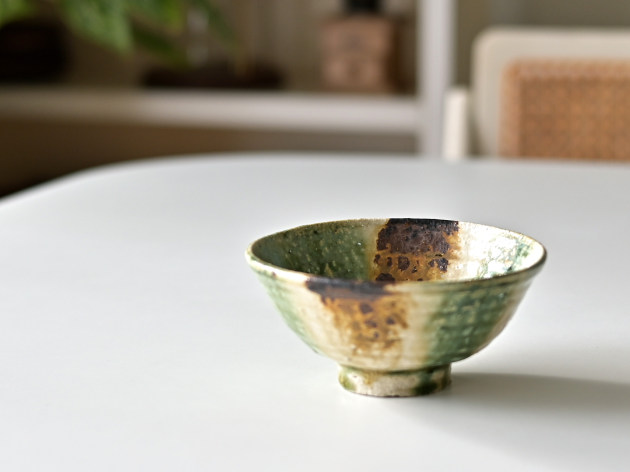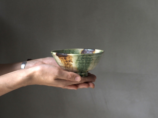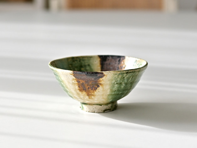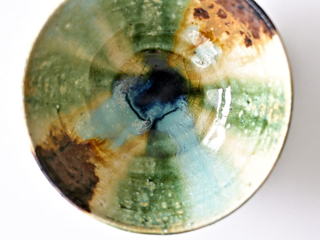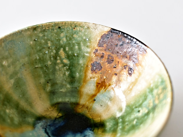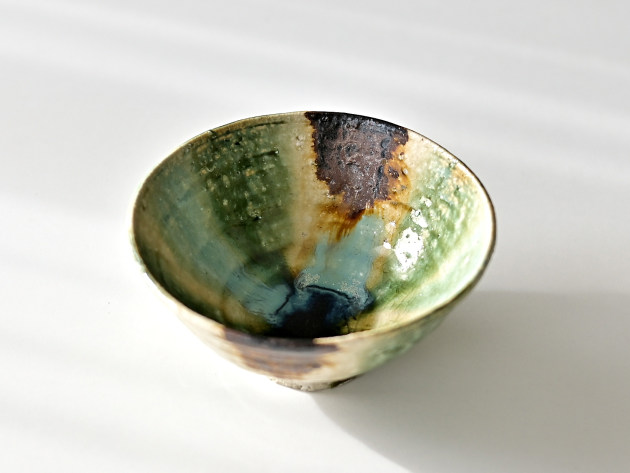 緑、茶、黄、そしてほんの少しのブルー。いろいろな色が交じり合った、にぎやかな焼き物です。 紐作りという技法で作られており、緩やかな歪みが味わい深いです。女性の手にもおさまりやすい、やや小ぶりのサイズの飯碗です。※こちらの商品は大きめの小石が混じっています。また、小石がはぜた跡や、鉄粉が吹いた跡が小さな穴になっています。 ■サイズ:径12.5cm×高さ6.3cm ※手作りの為、大きさ、形、色がひとつずつ多少異なることをご了承下さい。